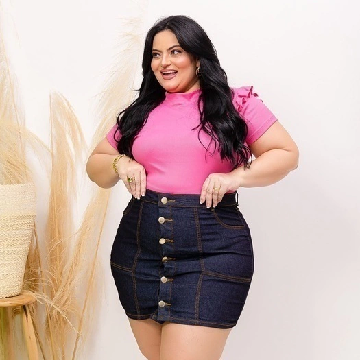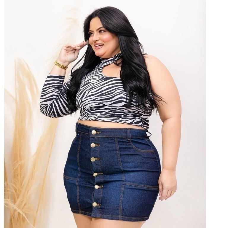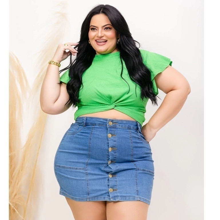 Saia Jeans Feminino Plus Size Com Botoes Com Elastano Jeans Claro e Escuro